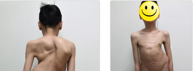 10年前,小普父母无意中发现孩子右侧背部有轻微凸出的情况(高凸畸形),遂到当地县医院检查,医生告知为“脊柱侧弯”,随后小普父母又将孩子带到昆明某医院,经CT及影像查看后,确诊为“脊柱侧弯”,医生曾建议手术,但父母担心孩子年龄太小及术后不能配合,便决定暂时不做手术。此后10来年,小普并无其它症状,就一直未进行诊治,但右侧背部高凸畸形却逐年加重并扭转,胸廓亦出现畸形。